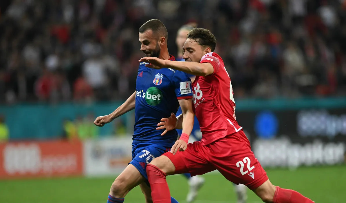 Laurentiu Corbu si Ahmed Mustafa Bani in meciul de fotbal dintre Dinamo Bucuresti si CSA Steaua Bucuresti, contand pentru Play-off-ul Ligii a-2-a Casa Pariurilor, desfasurat pe Arena Nationala din Bucuresti, luni 15 mai 2023. © FOTO:Razvan Pasarica/SPORT PICTURES