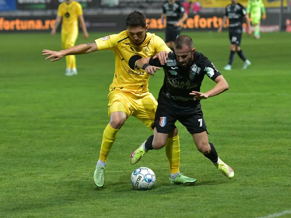 Razvan Toni Gradinaru si Laurentiu Nicolae Corbu in meciul de fotbal dintre Chindia Targoviste si Gaz Metan Medias, contand pentru Liga 1 Casa Pariurilor, desfasurat pe Stadionul Ilie Oana din Ploiesti, vineri 5 noiembrie 2021. © FOTO:Razvan Pasarica/SPORT PICTURES