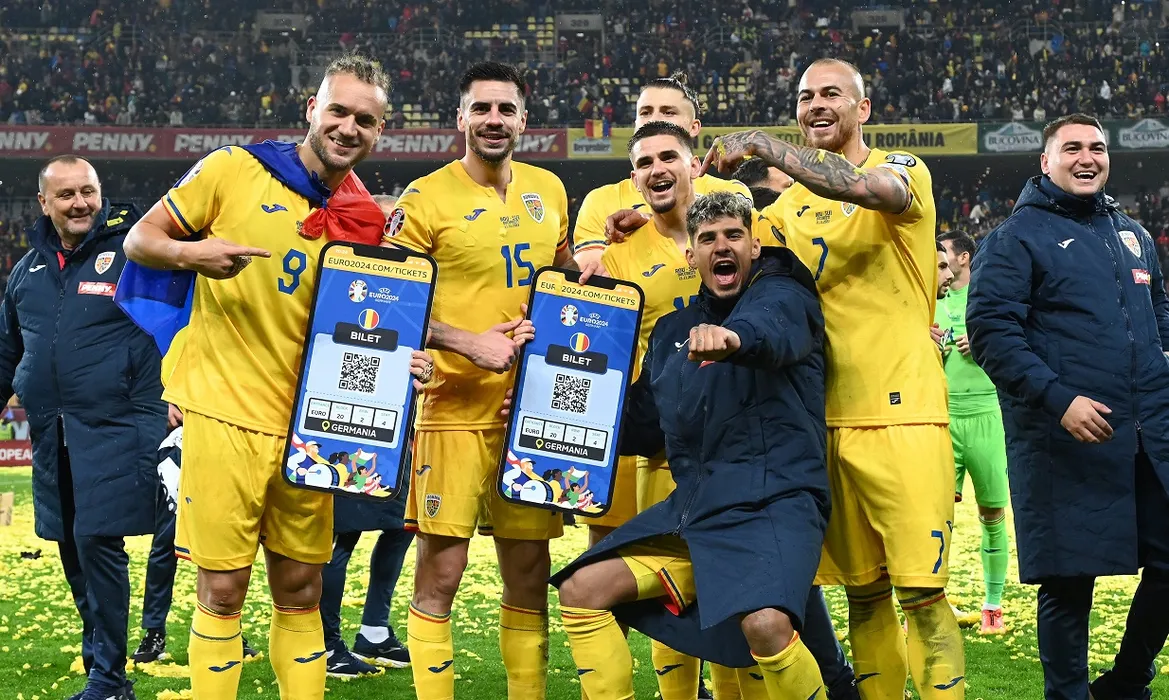 Florinel Coman, Radu Dragusin, Andrei Burca, Răzvan Marin , Radu Dragusin, George Puscas si Răzvan Marin pozeaza dupa calificarea obtinuta in urma meciului de fotbal dintre Romania si Elvetia, din cadrul preliminariilor Campionatului European 2024, desfasurat pe Arena Nationala, marti 21 noiembrie 2023. © FOTO:Razvan Pasarica/SPORT PICTURES