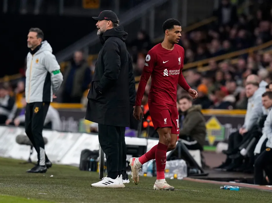 February 4, 2023, Wolverhampton: Wolverhampton, England, 4th February 2023. Cody Gakpo of Liverpool (R) walks past Jurgen Klopp manager of Liverpool after being subbed during the Premier League match at Molineux, Wolverhampton.,Image: 754064547, License: Rights-managed, Restrictions: * United Kingdom Rights OUT *, Model Release: no