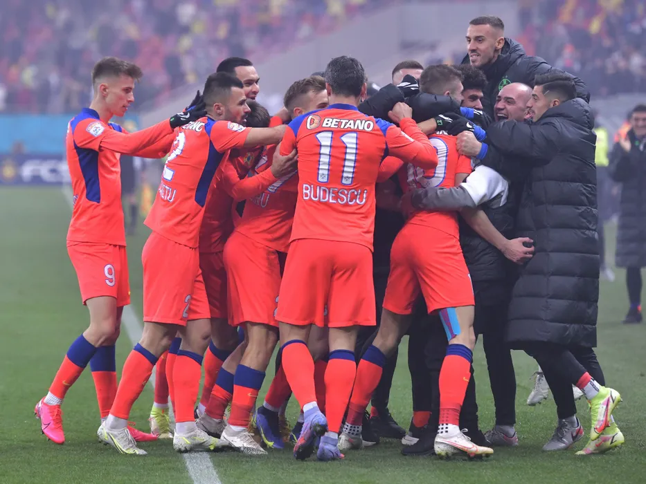 Bucurie a fotbalistilor stelisti dupa un gol marcat cu Adrian Gheorghe Sut, Valentin Cretu, Adrian Gheorghe Sut si Florin Lucian Tanase in meciul de fotbal dintre FCSB si Rapid Bucuresti, contand pentru Liga 1 Casa Pariurilor, desfasurat pe Arena Nationala din Bucuresti, miercuri 15 decembrie 2021. © FOTO:Razvan Pasarica/SPORT PICTURES