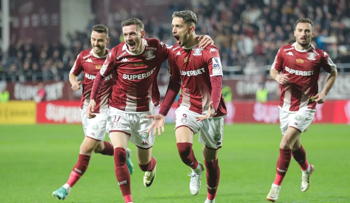 BUCHAREST, ROMANIA - FEBRUARY 28: Albion Rrahmani (R) of Rapid Bucuresti celebrates the goal scored with his teammate Ermal Krasniqi during the SuperLiga Round 28 match between Rapid Bucuresti and UTA Arad at Giulesti Stadium on February 28, 2024 in Bucharest, Romania. (Photo by Vasile Mihai-Antonio/Getty Images)