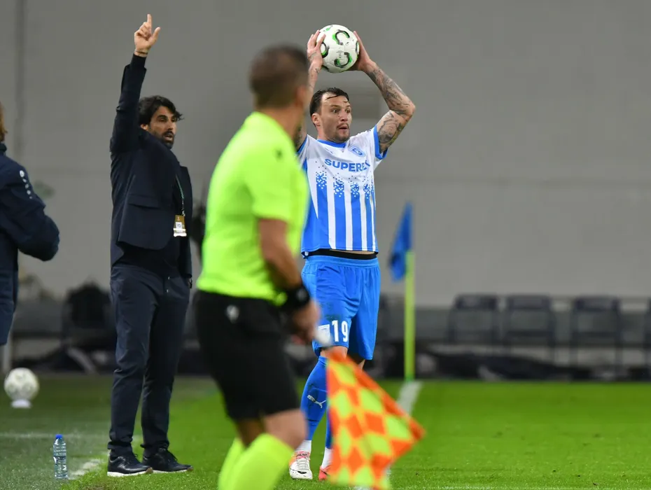 Vasile Mogos arunca de la margine, din apropierea lui Filipe Amaral Rino Coelho in meciul de fotbal dintre Universitatea Craiova si FSV Mainz 05, contand pentru Conference League, desfasurat pe Stadionul Ion Oblemenco din Craiova, joi 27 noiembrie 2025. © FOTO:Daniel George Ilinca/SPORT PICTURES