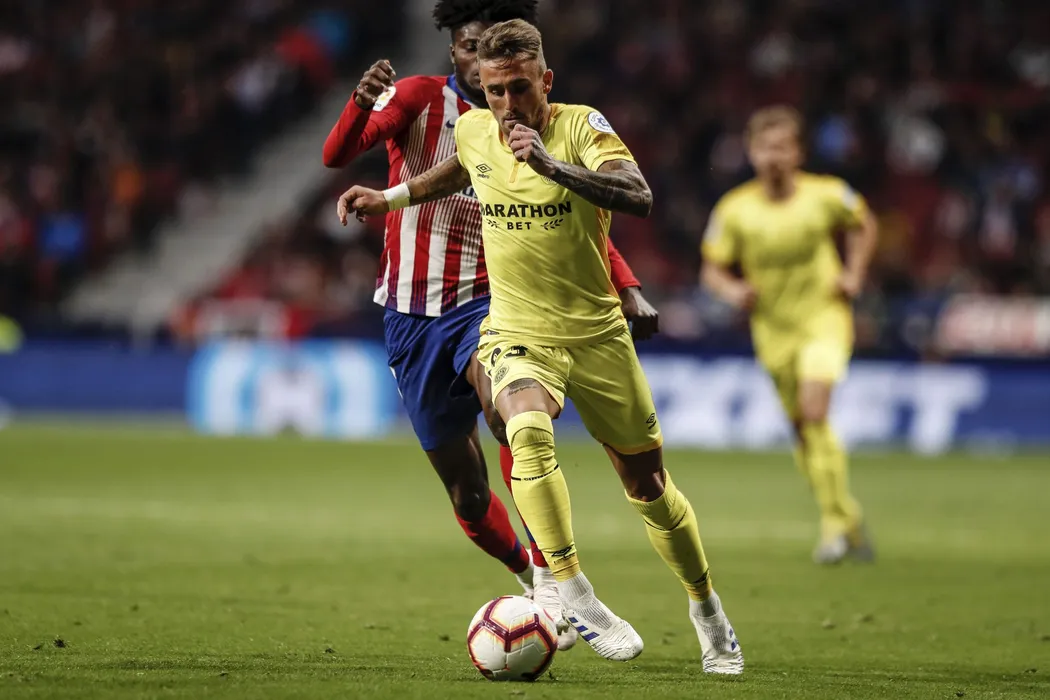 02 April 2019, Spain, Madrid: Atletico de Madrid's Thomas Partey (L) and Girona's Aleix Garcia battle for the ball during the Spanish Primera Division soccer match between Atletico Madrid and Girona FC at the Wanda Metropolitano stadium. Photo: Enrique de la Fuente/gtres/dpa