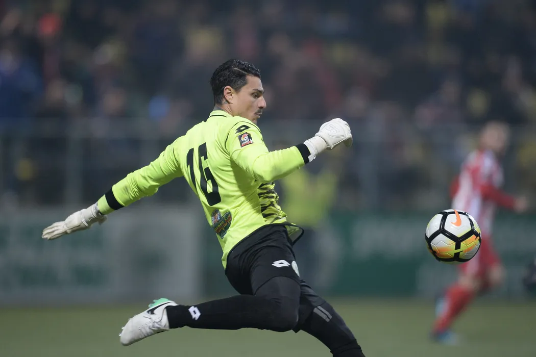 Portarul Alessandro Caparco, de la Concordia Chiajna, suteaza in timpul meciului de fotbal contra echipei Dinamo Bucuresti din etapa a XXIV-a a Ligii 1, disputat disputat pe stadionul Concordia din Chiajna, luni, 12 februarie 2018. ALEXANDRU DOBRE / MEDIAFAX FOTO