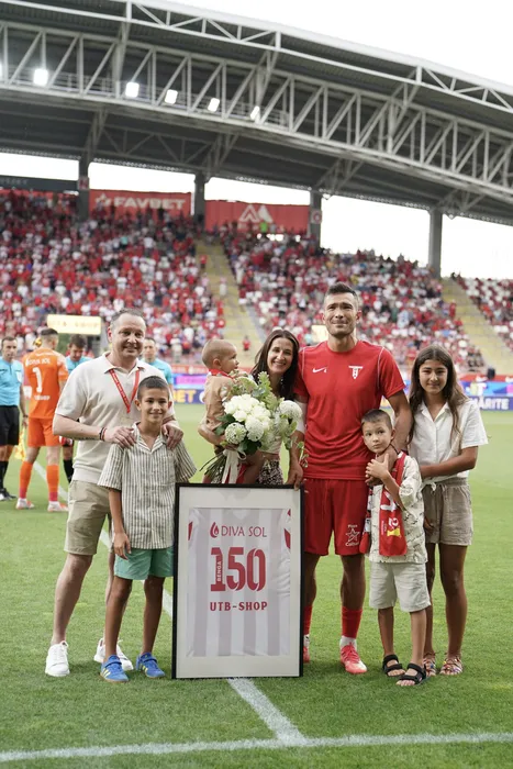 Alexandru Constantin Benga, cu familia, la meciul cu numarul 150, premiat la startul meciului de fotbal dintre UTA Arad si AFC Hermannstadt Sibiu, contand pentru Superliga Superbet, desfasurat pe Arena Francisc Neuman din Arad, sambata 26 iulie 2025. © FOTO:Alexandra Fechete/SPORT PICTURES