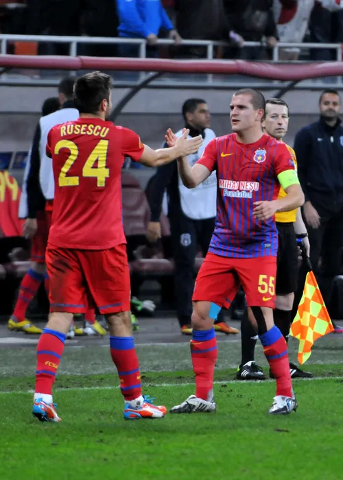 Alexandru Bourceanu il felicita pe Raul Rusescu dupa golul marcat.