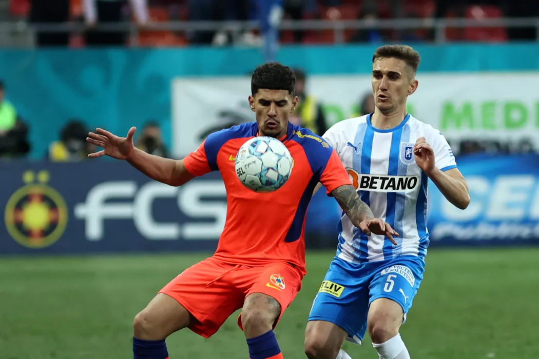 Florinel Coman (S), de la FCSB, lupta pentru balon cu Bogdan Vatajelu (D), de la Universitatea Craiova, in meciul de fotbal din etapa 3 a play-off-ului Ligii 1, disputat pe Arena Nationala din Bucuresti, duminica, 3 aprilie 2022. GEORGE FILIP / MEDIAFAX FOTO