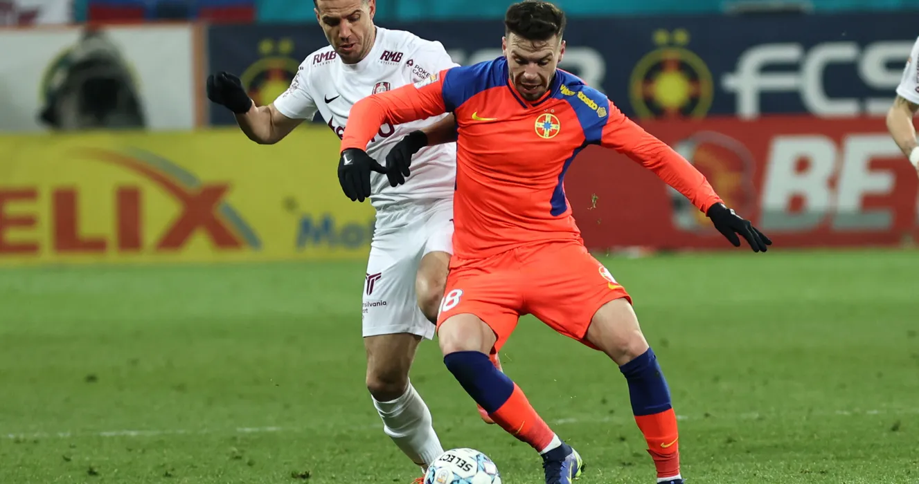 Andrei Cordea (D), de la FCSB, lupta pentru balon cu Alexandru Chipciu (S), de la CFR Cluj, in meciul de fotbal din etapa a XXIII-a a Ligii 1, disputat pe Arena Nationala din Bucuresti, duminica, 23 ianuarie 2022. GEORGE FILIP / MEDIAFAX FOTO