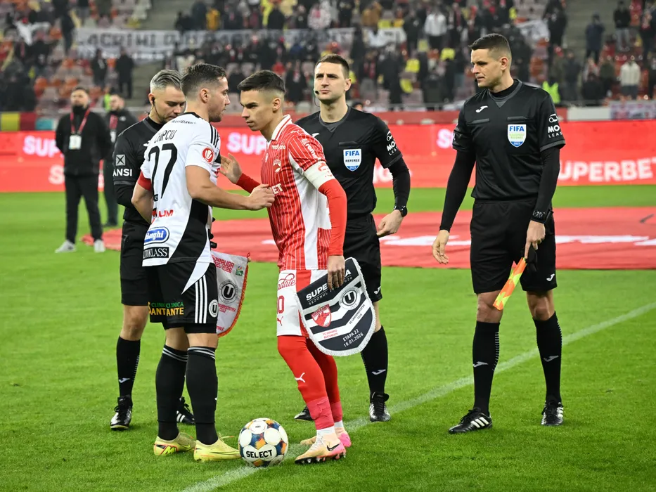 Brigada de arbitrii formată din George Florin Neacsu, Rares George Vidican si Alexandru Voda alături de căpitanii Mihaita Alexandru Chipciu si Catalin Ionut Cirjan la meciul de fotbal dintre Dinamo Bucuresti si Universitatea Cluj, din cadrul Superligii Superbet, desfasurat pe Arena Nationala din Bucuresti, duminica 18 ianuarie 2026. © FOTO:Razvan Pasarica/SPORT PICTURES