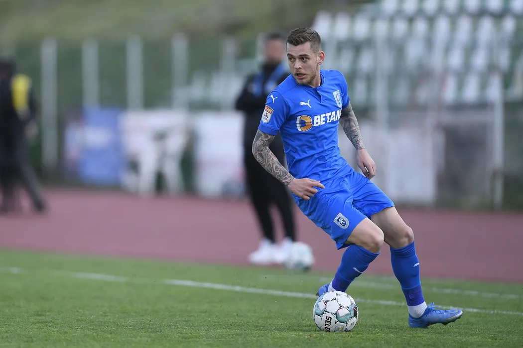 Alexandru Cicaldau, de la Universitatea Craiova, suteaza in timpul meciului de fotbal contra echipei Sepsi OSK din etapa 6 a play-off-ului Ligii 1, disputat pe stadionul Municipal din Sfantu Gheorghe, miercuri, 5 mai 2021. ALEX NICODIM / MEDIAFAX FOTO