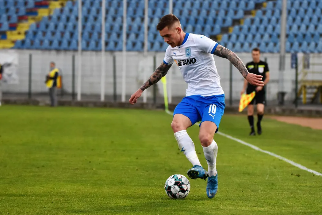 Alexandru Cicaldau, de la Universitatea Craiova, suteaza in timpul meciului de fotbal contra echipei FC Botosani din etapa a doua a play-off-ului Ligii 1, disputat pe stadionul Municipal din Botosani, miercuri, 21 aprilie 2021. DRAGOS PASCANEANU / MEDIAFAX FOTO
