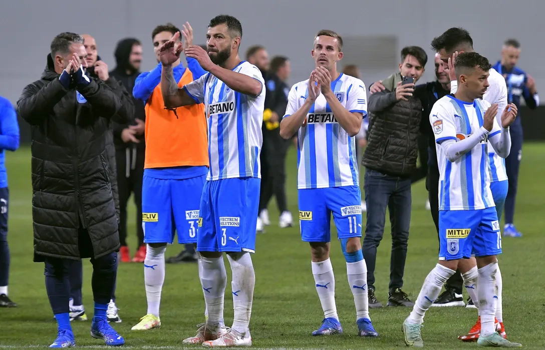 Fotbalistii craioveni Marius Marcel Constantin, Nicusor Silviu Bancu si Lyes Hafid Houri saluta suporterii dupa meciul de fotbal dintre Universitatea Craiova si CFR Cluj, contand pentru Cupa Romaniei, desfasurat pe Stadionul Ion Oblemenco din Craiova, joi 23 septembrie 2021. © FOTO:Razvan Pasarica/SPORT PICTURES