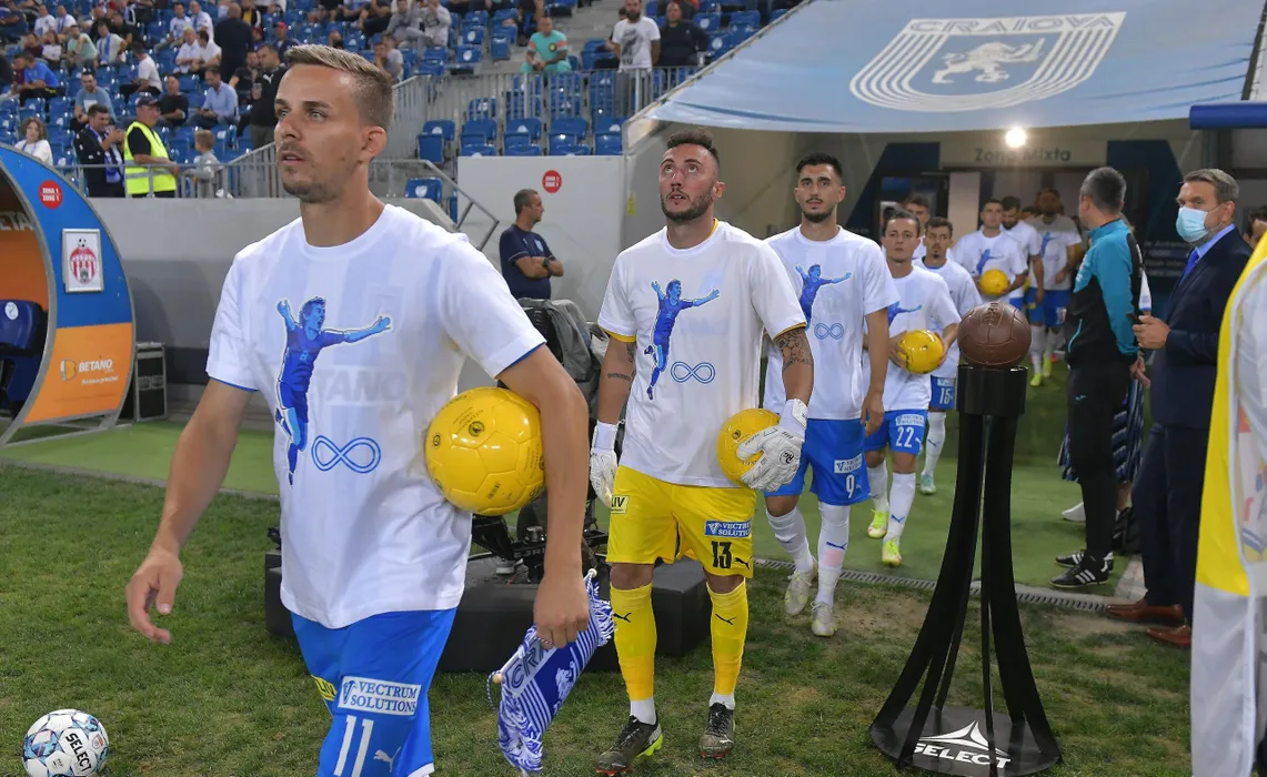 Fotbalistii craioveni intra pe teren in frunte cu Nicusor Silviu Bancu, Mirko Pigliacelli si Andrei Virgil Ivan in meciul de fotbal dintre Universitatea Craiova si Sepsi OSK Sfantu Gheorghe, contand pentru Liga 1 Casa Pariurilor, desfasurat pe Stadionul Ion Oblemenco din Craiova, luni 13 septembrie 2021. © FOTO:Razvan Pasarica/SPORT PICTURES