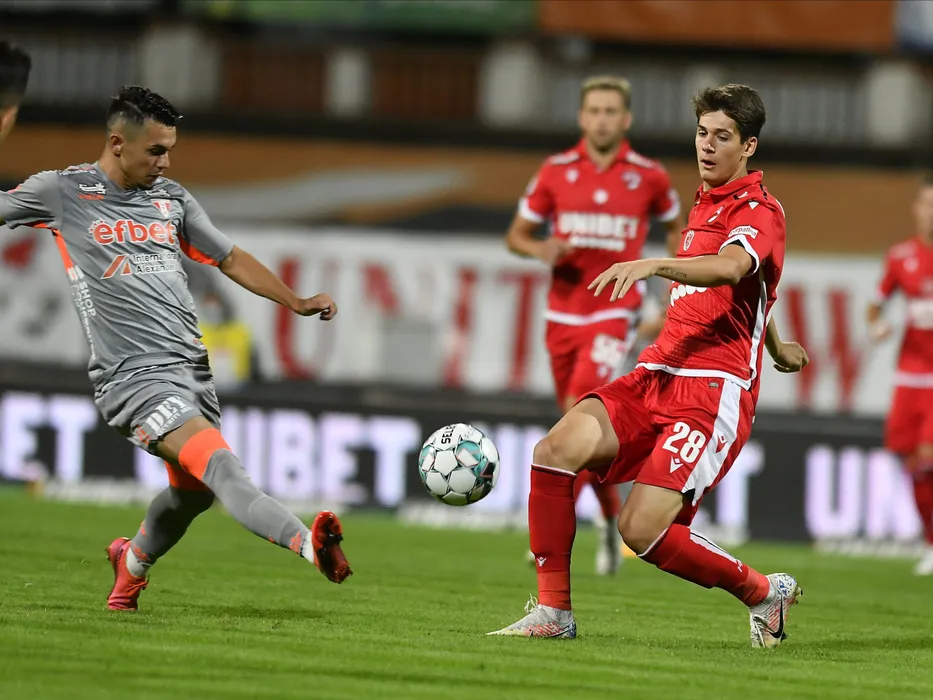 Denis Alex Rusu si Valentin Ioan Borcea in meciul de fotbal dintre Dinamo Bucuresti si UTA Arad, contand pentru Liga 1 Casa Pariurilor, desfasurat fara spectatori pe Stadionul Dinamo din Bucuresti, luni 28 septembrie 2020. © FOTO:Razvan Pasarica/SPORT PICTURES