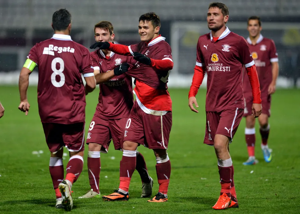 Alexandru Ionita, de la Rapid Bucuresti, este felicitat de Nicolae Vasile si Valentin Negru pentru golul marcat, in timpul meciului cu ACS Berceni, din Liga a II-a, disputat in Bucuresti, miercuri, 27 noiembrie 2013. LAURENTIU MICH / MEDIAFAX FOTO