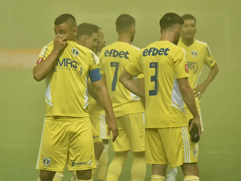 Fotbalistii ploiesteni printre care Valentin Constantin Ticu se protejeaza de gazul fumigenelor la meciul de fotbal dintre Petrolul Ploiesti si Rapid Bucuresti, contand pentru Superliga Superbet, desfasurat pe Stadionul Ilie Oana din Ploiesti, sambata 13 august 2022. © FOTO:Razvan Pasarica/SPORT PICTURES