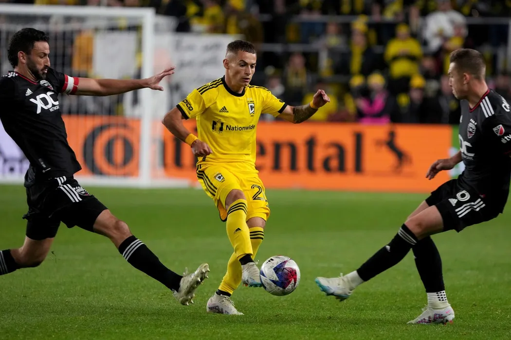 COLUMBUS, OH - MARCH 04: Alexandru Matan (20) of the Columbus Crew dribbles the ball during the second half between the the Columbus Crew and the D.C. United at Lower.com Field in Columbus, Ohio on March 4, 2023.,Image: 760416742, License: Rights-managed, Restrictions: This content is intended for editorial use only. For other uses, additional clearances may be required.