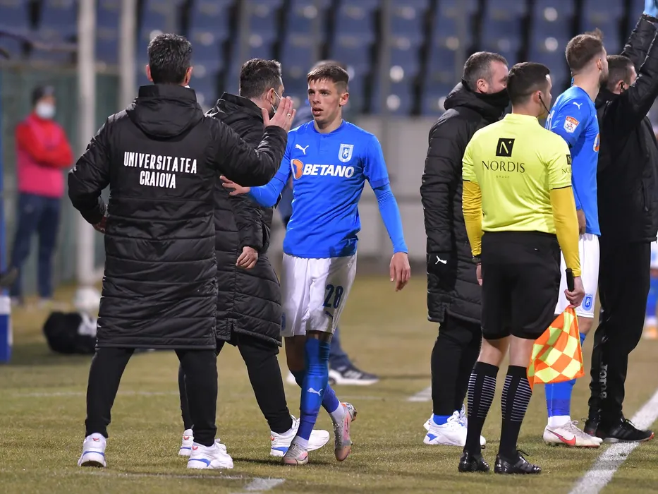Alexandru George Cimpanu este felicitat la iesirea din teren din meciul de fotbal dintre Chindia Targoviste si Universitatea Craiova, contand pentru Cupa Romaniei, desfasurat pe Stadionul Gloria din Buzau, marti 2 martie 2021. © FOTO:Razvan Pasarica/SPORT PICTURES