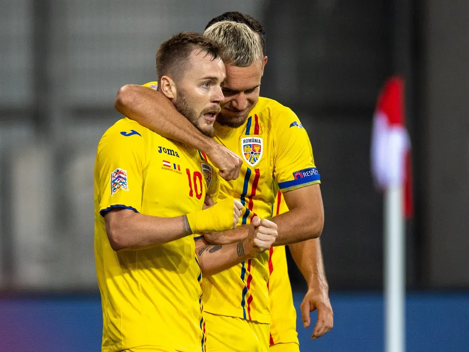 Alexandru Maxim se bucura dupa un gol marcat alaturi de George Puscas in meciul de fotbal dintre Austria si Romania, contand pentru Liga Natiunilor, desfasurat fara spectatori pe Stadionul Wörthersee din Klagenfurt, luni 7 septembrie 2020. © FOTO:SPORT PICTURES