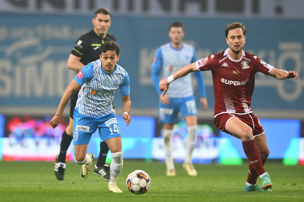 Lyes Hafid Houri si Damjan Djokovic în meciul de fotbal dintre Universitatea Craiova si Rapid Bucuresti, contând pentru Play off-ul Superligii Superbet, desfășurat pe Stadionul Ion Oblemenco din Craiova, sambata 30 martie 2024. © FOTO:SPORT PICTURES
