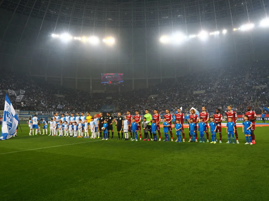 Fotbaliștii celor doua echipe alături de brigada de arbitri la startul meciului de fotbal dintre Universitatea Craiova si Rapid Bucuresti, contând pentru Play off-ul Superligii Superbet, desfășurat pe Stadionul Ion Oblemenco din Craiova, sambata 30 martie 2024. © FOTO:SPORT PICTURES