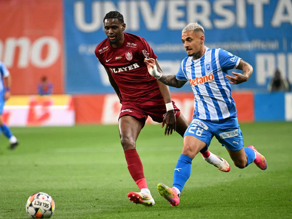 Beni Jean Luc Nkololo si Ionuț Alexandru Mitriță in meciul dintre Universitatea Craiova si CFR Cluj, contand pentru Play off-ul Superligii Superbet, desfasurat pe Stadionul Ion Oblemenco din Craiova, sambata 10 mai 2025. © FOTO:Razvan Pasarica/SPORT PICTURES