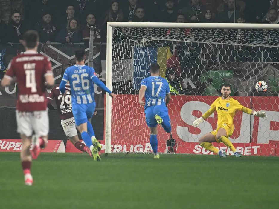 Mihai Alexandru Dobre marchează un gol în poarta lui Iulian Laurențiu Popescu in meciul de fotbal dintre Rapid Bucuresti si Universitatea Craiova, din cadrul Superligii Superbet, desfasurat pe Superbet Arena-Giulesti din Bucuresti, sambata 25 ianuarie 2025. © FOTO:Razvan Pasarica/SPORT PICTURES