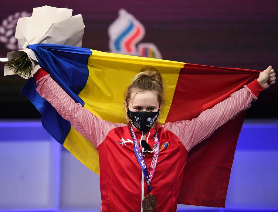 6510922 07.04.2021 Romania's Raluca Olaru celebrates her bronze medal during the awarding ceremony for the women's 71 kg category competition at the European Weightlifting Championships in Moscow, Russia.,Image: 603977119, License: Rights-managed, Restrictions: , Model Release: no