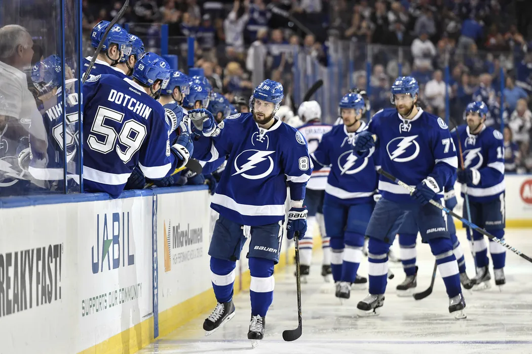 TAMPA, FL - FEBRUARY 21: Tampa Bay Lightning right wing Nikita Kucherov (86) celebrates his goal with the bench during the third period of an NHL game between the Edmonton Oilers and the Tampa Bay Lightning on February 21, 2017, at Amalie Arena in Tampa, FL. The Lightning defeated the Oilers 4-1. (Photo by Roy K. Miller/Icon Sportswire via Getty Images)