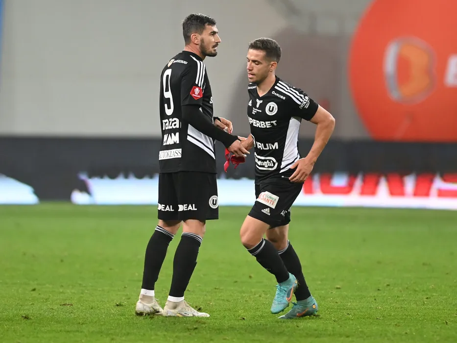 Mihaita Alexandru Chipciu ii da banderola de capitan lui Adrian Ionut Balan in meciul de fotbal dintre Universitatea Craiova si Universitatea Cluj, contand pentru Superliga Superbet, desfasurat pe Stadionul Ion Oblemenco din Craiova, sambata 5 noiembrie 2022. © FOTO:Razvan Pasarica/SPORT PICTURES