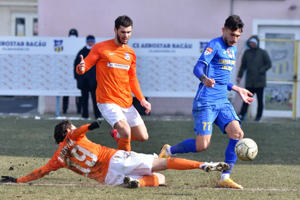 Adrian Moldovan (D), de la FC Unirea Slobozia, si Alexandru Corban (C), de la CS Aerostar Bacau, lupta pentru posesia balonului in meciul de fotbal dintre CS Aerostar Bacau si FC Unirea Slobozia, disputat pe stadionul Aerostar din Bacau, sambata, 20 februarie 2021. DRAGOS PASCANEANU / MEDIAFAX FOTO