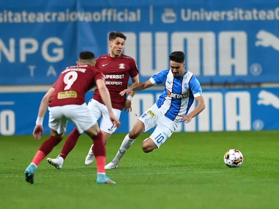 Antonio Valentin Sefer si Stefan Baiaram in meciul de fotbal dintre Universitatea Craiova si Rapid Bucuresti, contand pentru Play-off-ul Superligii Superbet, desfasurat pe Stadionul Ion Oblemenco din Craiova, duminica 16 aprilie 2023. © FOTO:Razvan Pasarica/SPORT PICTURES