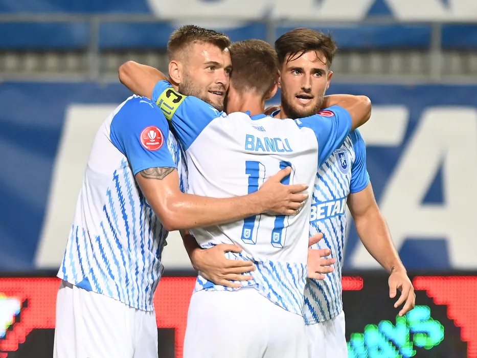 Alexandru Cretu se bucura dupa un gol marcat alaturi de Cristian Mihai Capatina si Nicusor Silviu Bancu in meciul de fotbal dintre Universitatea Craiova si UTA Arad, contand pentru Superliga Superbet, desfasurat pe Stadionul Ion Oblemenco din Craiova, vineri 18 august 2023. © FOTO:Razvan Pasarica/SPORT PICTURES
