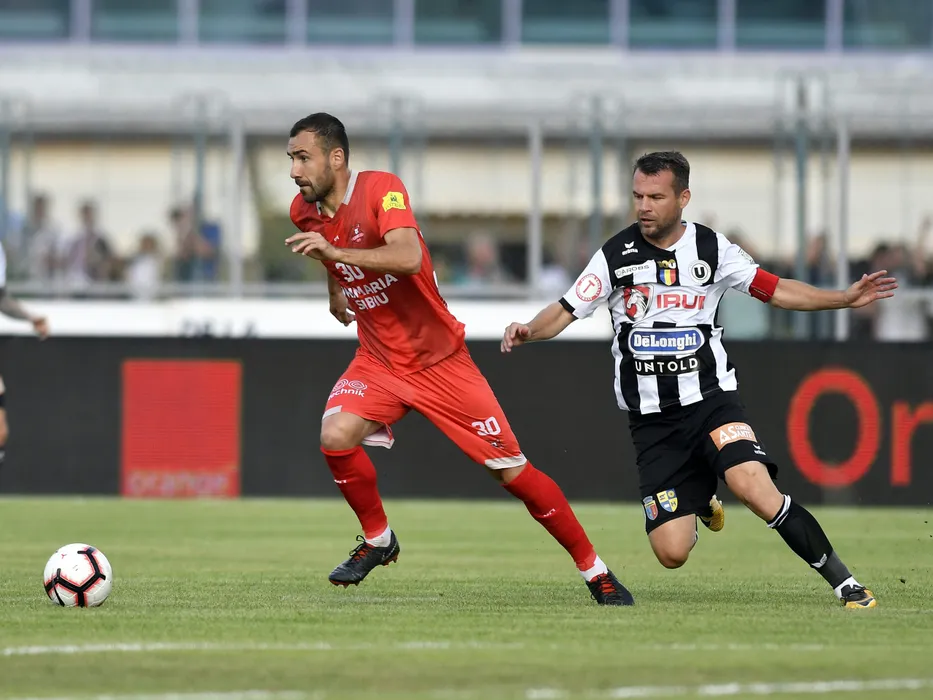 Alexandru Dandea si Dorin Goga in meciul de fotbal dintre AFC Hermannstadt si Universitatea Cluj, contand pentru barajul retur de mentinere in Liga 1 Betano, desfasurat pe Stadionul Municipal din Sibiu, mercuri 12 iunie 2019. © FOTO:Razvan Pasarica/SPORT PICTURES