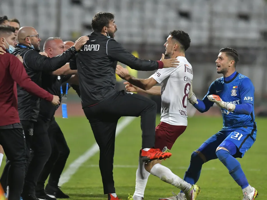 Bucurie rapidista cu Mihai Iosif, Nicolae Carnat si Horatiu Alexandru Moldovan in meciul de fotbal dintre Dinamo Bucuresti si Rapid Bucuresti, contand pentru Liga 1 Casa Pariurilor, desfasurat pe Stadionul Dinamo din Bucuresti, sambata 23 octombrie 2021. © FOTO:Razvan Pasarica/SPORT PICTURES