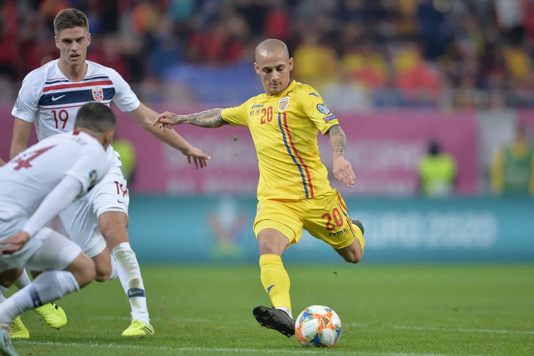 Ionut Mitrita (D), de la nationala Romaniei, suteaza in timpul meciului de fotbal contra selectionatei Norvegiei, din Grupa F a preliminariilor Euro 2020, disputat pe Arena Nationala din Bucuresti, marti, 15 octombrie 2019. ALEXANDRU DOBRE / MEDIAFAX FOTO