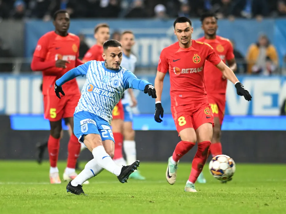 Ionuț Alexandru Mitriță si Adrian Gheorghe Șut în meciul de fotbal dintre Universitatea Craiova si FCSB, contând pentru Superliga Superbet, desfășurat pe Stadionul Ion Oblemenco din Craiova, duminica 28 ianuarie 2024. © FOTO: Răzvan PĂSĂRICĂ/SPORT PICTURES