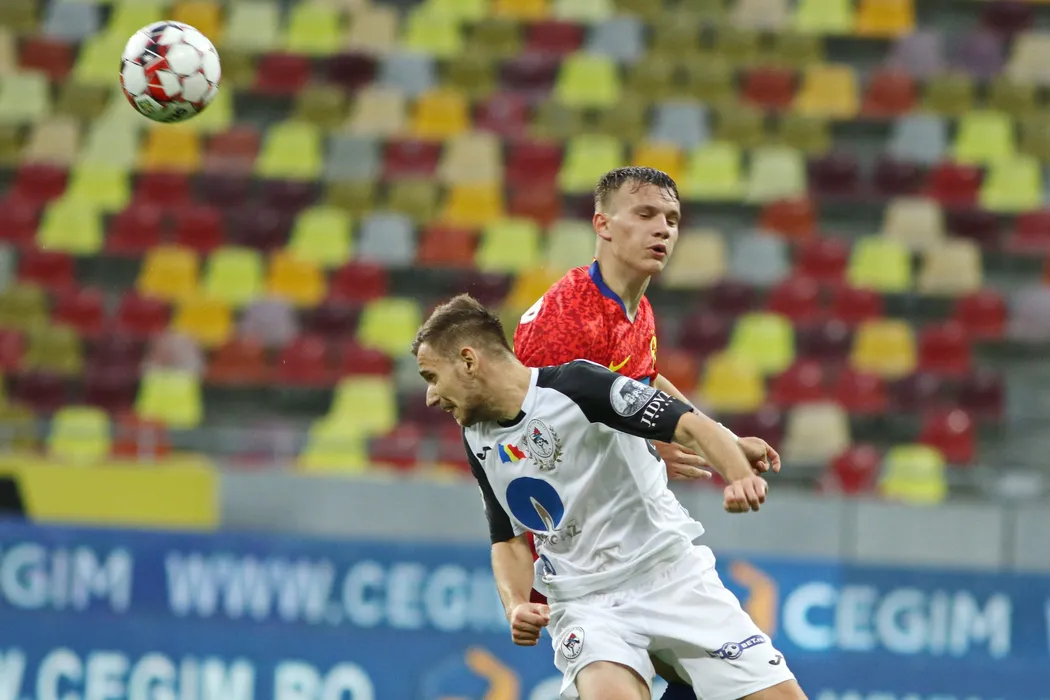 Grigoras Pantea (D), de la FCB, lupta pentru balon cu Sergiu Ciocan (S), de la Gaz Metan Medias, in timpul meciului de fotbal din etapa a IV-a a play-off-ului Ligii 1, disputat pe Arena Nationala din Bucuresti, duminica, 21 iunie 2020. George Filip/ MEDIAFAX FOTO