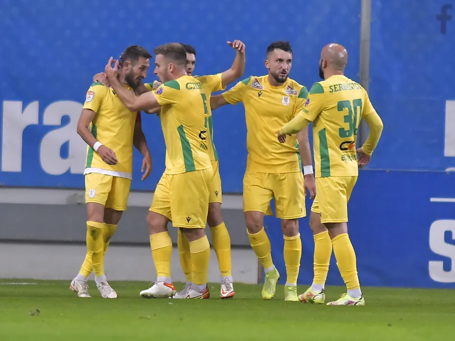Bucurie a fotbalistilor din Mioveni dupa un gol marcat cu Gheorghe Bogdan Rusu, Adrian Blazej Cierpka si Mihai Andrei Panait in meciul de fotbal dintre Universitatea Craiova si CS Mioveni, contand pentru Liga 1 Casa Pariurilor, desfasurat pe Stadionul Ion Oblemenco din Craiova, sambata 30 octombrie 2021. © FOTO:Razvan Pasarica/SPORT PICTURES