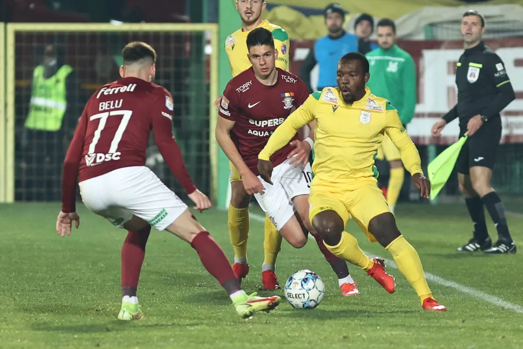 Sanoh Moussa, Claudiu Iordache si Rares Ilie in meciul de fotbal dintre Rapid Bucuresti si CS Mioveni, contand pentru Liga 1 Casa Pariurilor, desfasurat pe stadionul Orasenesc din Mioveni, sambata 27 noiembrie 2021. © FOTO:Gheorghe Fluster/SPORT PICTURES