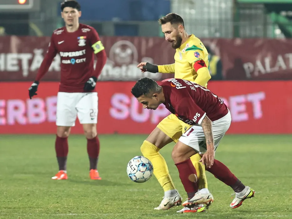 Junior Morais si Bogdan Rusu in meciul de fotbal dintre Rapid Bucuresti si CS Mioveni, contand pentru Liga 1 Casa Pariurilor, desfasurat pe stadionul Orasenesc din Mioveni, sambata 27 noiembrie 2021. © FOTO:Gheorghe Fluster/SPORT PICTURES