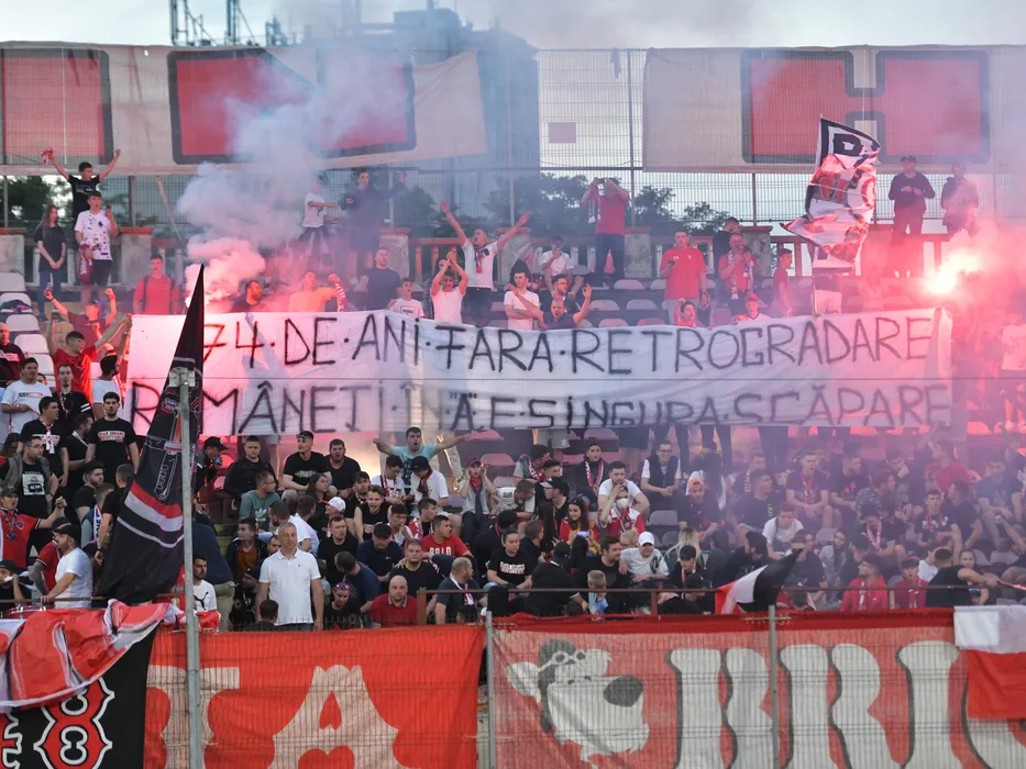 Baner al galeriei dinamoviste cu referire la cei 74 de ani de existenta a clubului afista in meciul de fotbal dintre Dinamo Bucuresti si UTA Arad, contand pentru Play-out-ul Ligii 1 Casa Pariurilor, desfasurat pe Stadionul Dinamo din Bucuresti, vineri 13 mai 2022. © FOTO:Razvan Pasarica/SPORT PICTURES