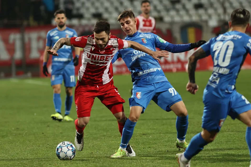 Meciul de fotbal dintre echipele FC Dinamo si Chindia Targoviste (echipament albastru) din etapa a XIX-a a Ligii 1, disputat pe stadionul Dinamo din Bucuresti, luni, 13 decembrie 2021. GEORGE FILIP / MEDIAFAX FOTO