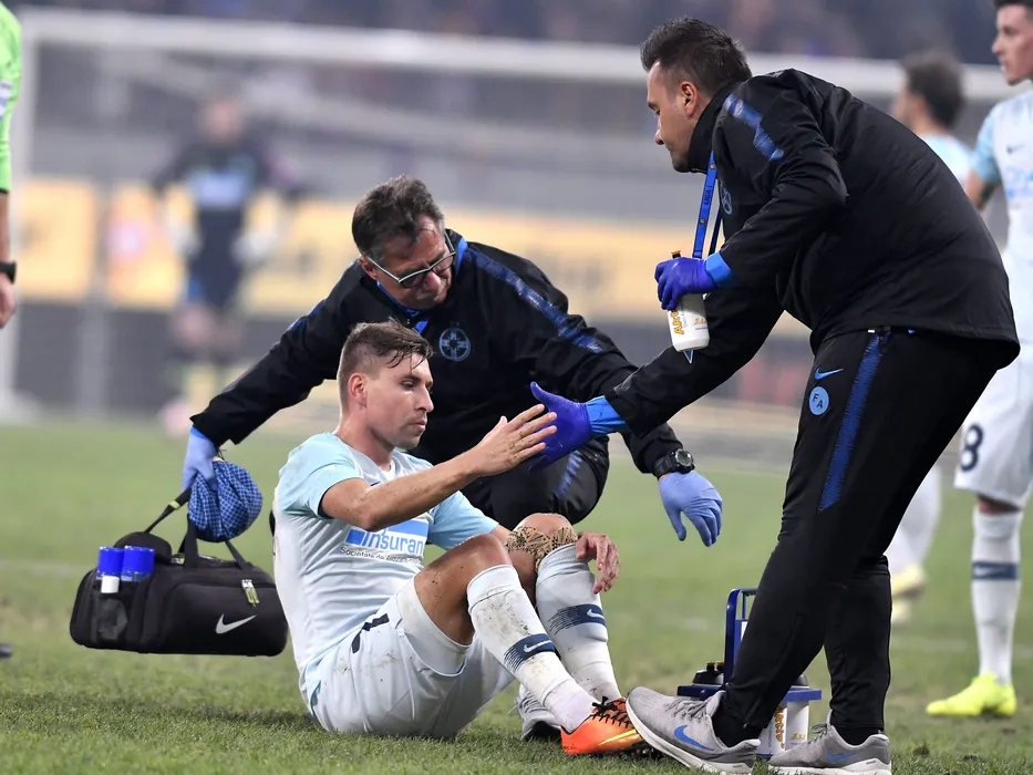 Alexandru Stan primeste ingrijire medicala in meciul de fotbal dintre Dinamo Bucuresti si FCSB, contand pentru Liga 1 Betano, disputat pe Arena Nationala din Bucuresti, duminica 11 noiembrie 2018. © FOTO Razvan Pasarica/SPORT PICTURES