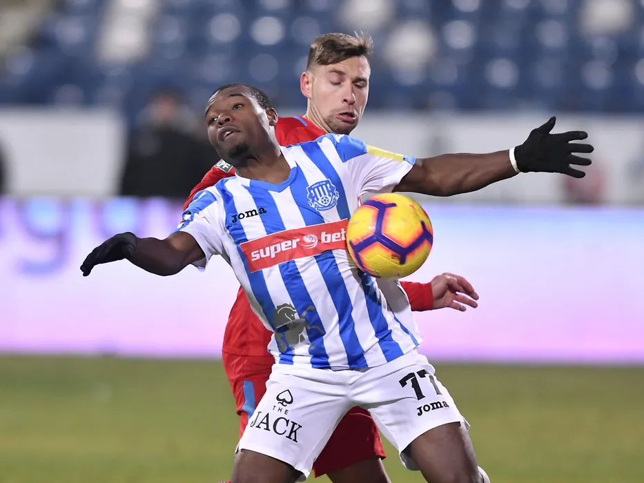 Moussa Sanoh si Alexandru Stan in meciul de fotbal dintre CSM Politehnica Iasi si FCSB, contand pentru Liga 1 Betano, desfasurat pe Stadionul Emil Alexandrescu din Iasi, duminica 25 noiembrie 2018. © FOTO Razvan Pasarica/SPORT PICTURES