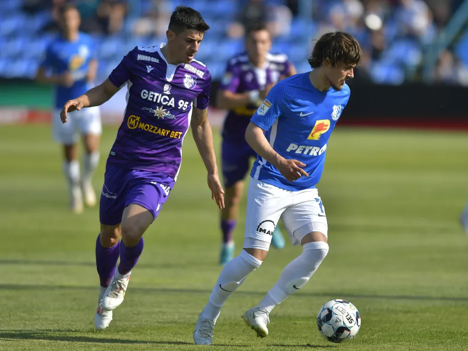 Costinel Andrei Tofan si Alexi Paul Pitu in meciul de fotbal dintre Farul Constanta si FC Arges, contand pentru Play off-ul Ligii 1 Casa Pariurilor, desfasurat pe Stadionul central al Academiei Gheorghe Hagi din Ovidiu, sambata 14 mai 2022. © FOTO:Razvan Pasarica/SPORT PICTURES