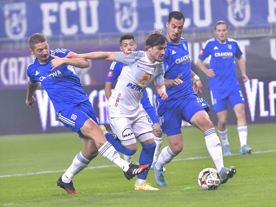 Alexandru Vlad Achim, Alexi Paul Pitu si Duarte Andre Lourenco in meciul de fotbal dintre FC U Craiova si Farul Constanta, contand pentru Superliga Superbet, desfasurat pe Stadionul Ion Oblemenco din Craiova, vineri 28 octombrie 2022. © FOTO:Razvan Pasarica/SPORT PICTURES