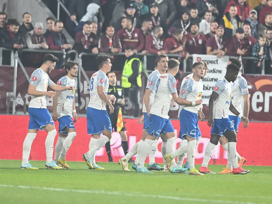 Bucurie a fotbalistilor constanteni dupa un gol marcat cu Dan Sirbu, Alexi Paul Pitu, Andrei Viorel Artean, Ionut Justinian Larie, Constantin Grameni si Enagnon David Kiki in meciul de fotbal dintre Rapid Bucuresti si Farul Constanta, contand pentru Superliga Superbet, desfasurat pe Stadionul Rapid Giulesti din Bucuresti, vineri 21 octombrie 2022. © FOTO:Razvan Pasarica/SPORT PICTURES