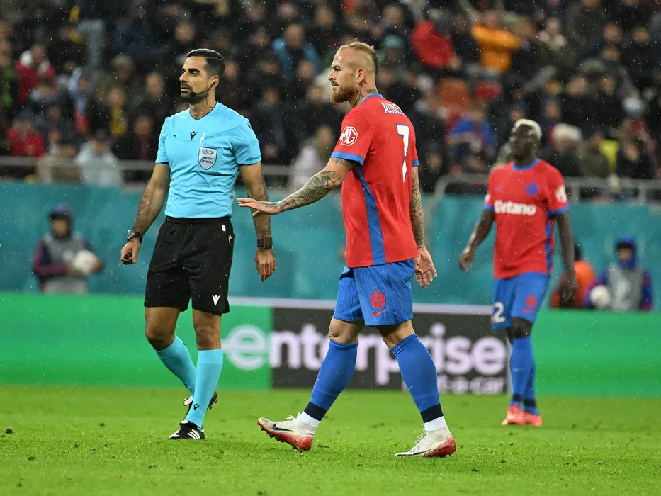 Denis Alibec reacționează alături de arbitrul central Mohammed Al-Hakim in meciul de fotbal dintre FCSB si Young Boys Berna, contand pentru UEFA Europa League, desfasurat pe Arena Nationala din Bucuresti, joi 2 octombrie 2025. © FOTO:Razvan Pasarica/SPORT PICTURES